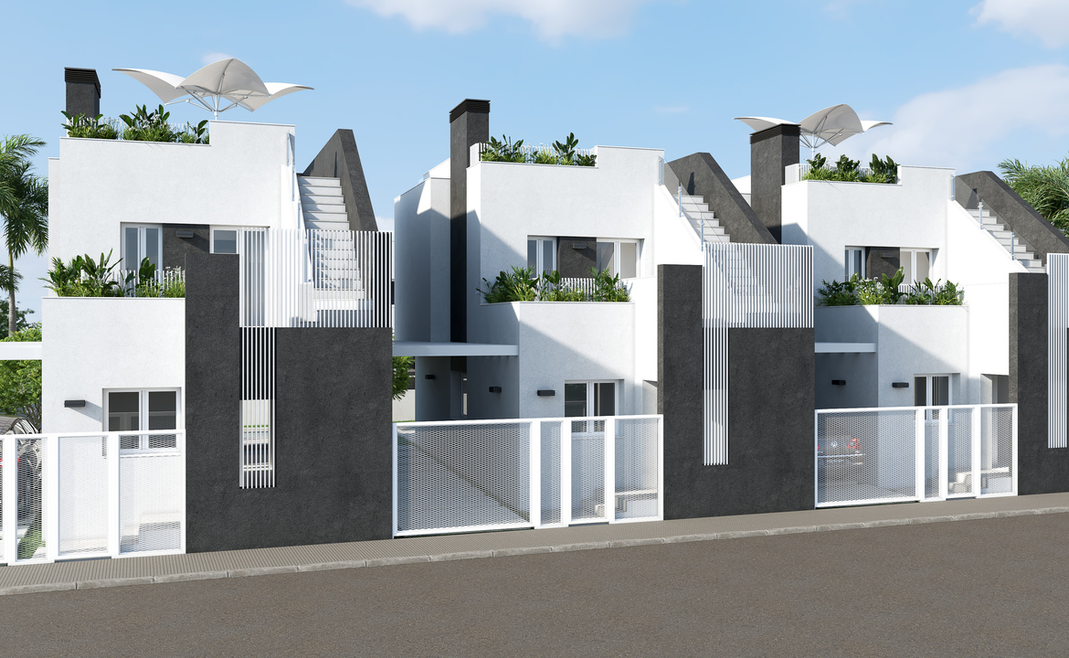 Przedstawiamy nowy projekt, kameralne osiedle składający się z 6 nowoczesnych niezależnych domów z prywatnym basenem i miejscem parkingowym na działce i solarium na dachu. Zlokalizowany w Pilar de la Horadada w dobrej lokalizacji, w pobliżu wszystkich udogodnień, sklepów, usług i restauracji, 500 metrów od głównej ulicy miasta i 2 km od morza i plaży.