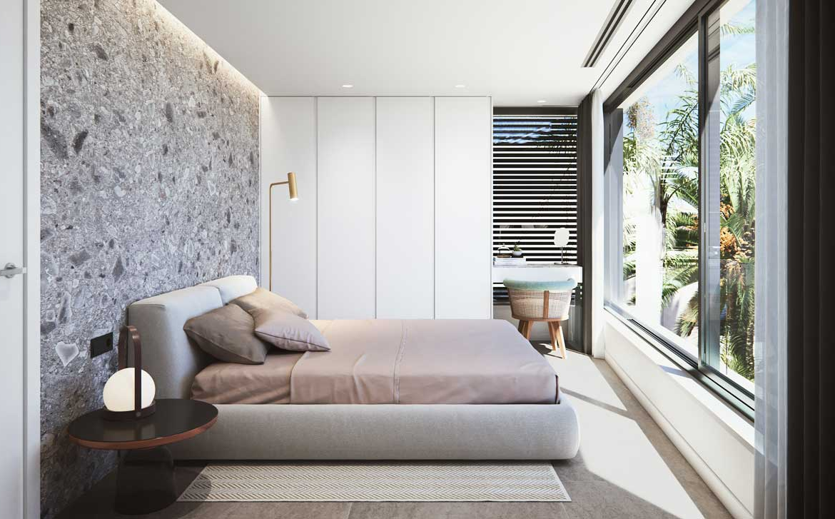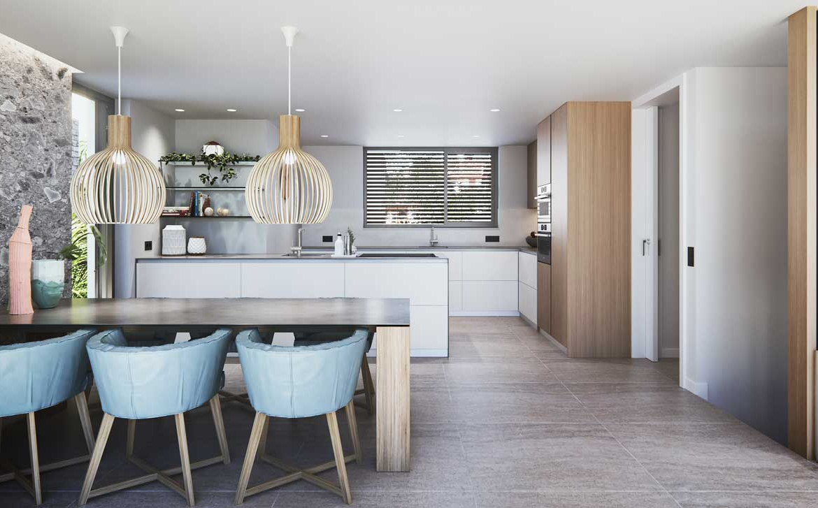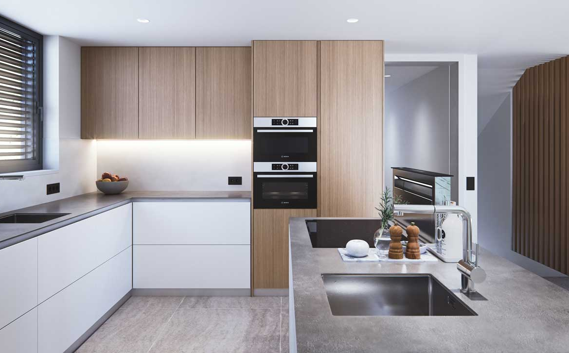 Dzięki dużym oknom od podłogi do sufitu, które maksymalnie wykorzystują naturalne światło, uzyskuje się ciepłe i przytulne pokoje. Łazienki są całkowicie wykończone. Kuchnia jest w pełni konfigurowalna, nowoczesna i elegancka, zawiera wysokiej klasy sprzęt wbudowany w projekt, ponadto zawiera zintegrowaną piwniczkę na wino.